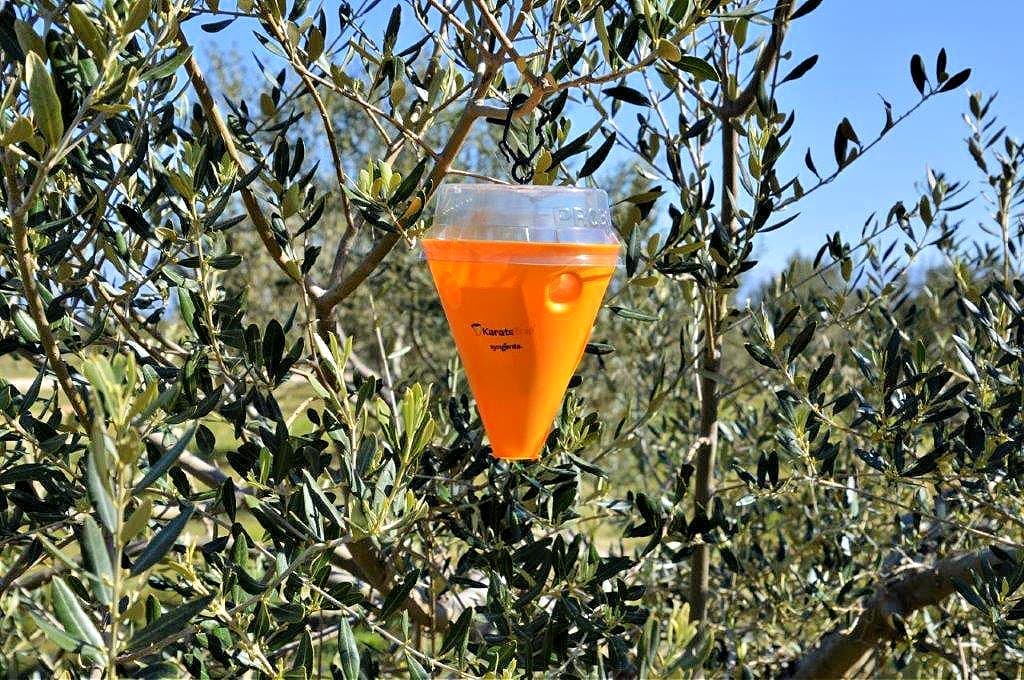 According to Syngenta, this trap is a “massive capture device for the control of the olive fly using the attract and kill technique, composed of a specific attractant, a trap composed of a base and lid with insecticide.”