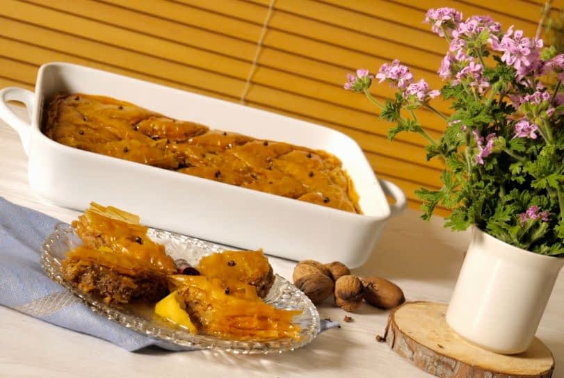 Baklava is made with layers of crispy pastry phyllo dough filled with crushed nuts, sugar, clove and cinnamon and sprayed with heated olive oil before baking.