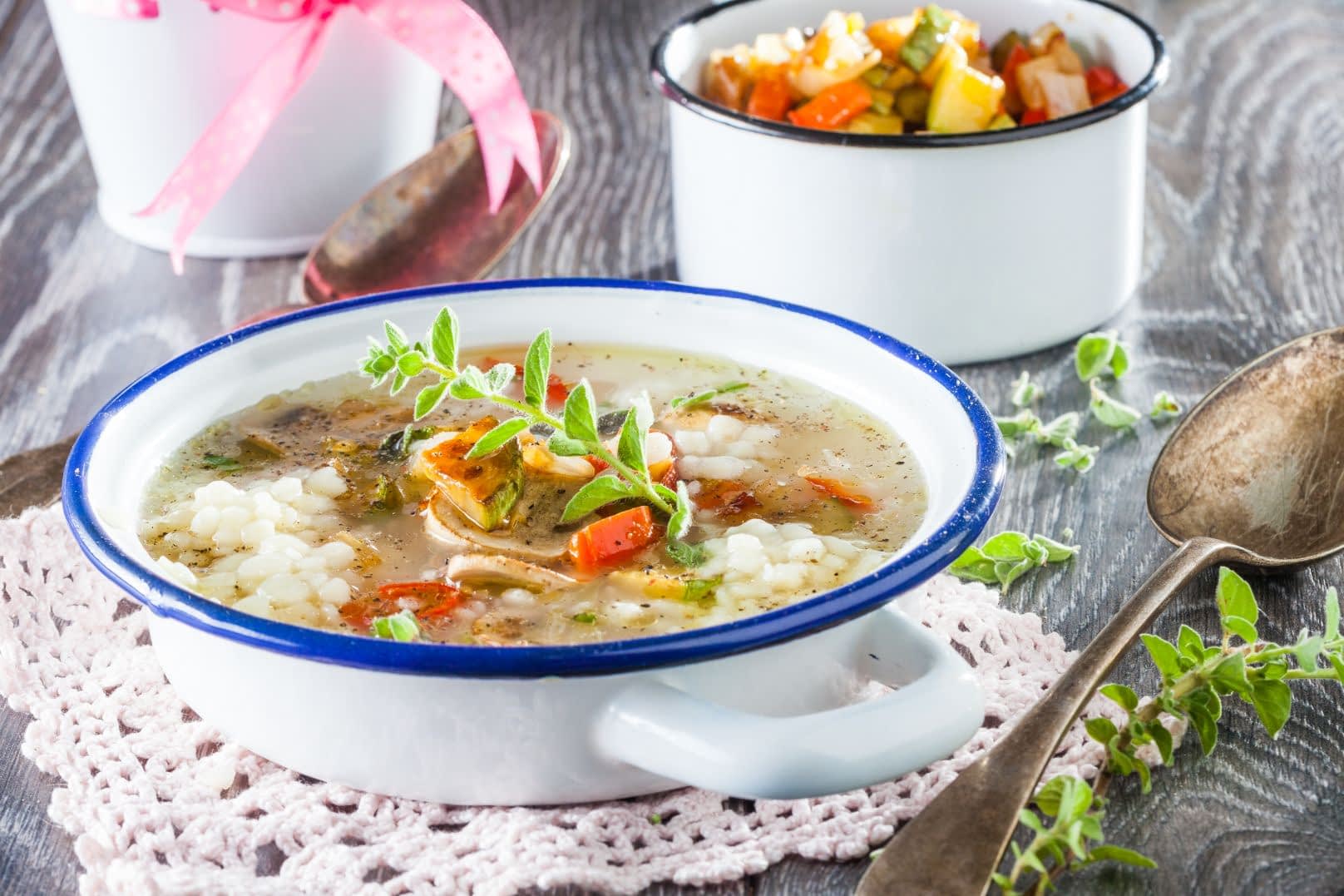 To prepare the soup, the chef first uses a pan to sauté finely chopped onion in olive oil. She then adds the trachana and a liter of vegetable stock or water and brings the mixture to a boil. After, Nikolaou lets it simmer for about 20 minutes until reduced.