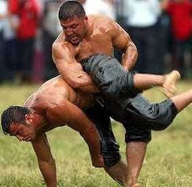 For once it doesn't matter if it's fruity, bitter or pungent. It just need to be slippery. Still, nothing but olive oil will do when wrestlers square off in this ancient ritual.