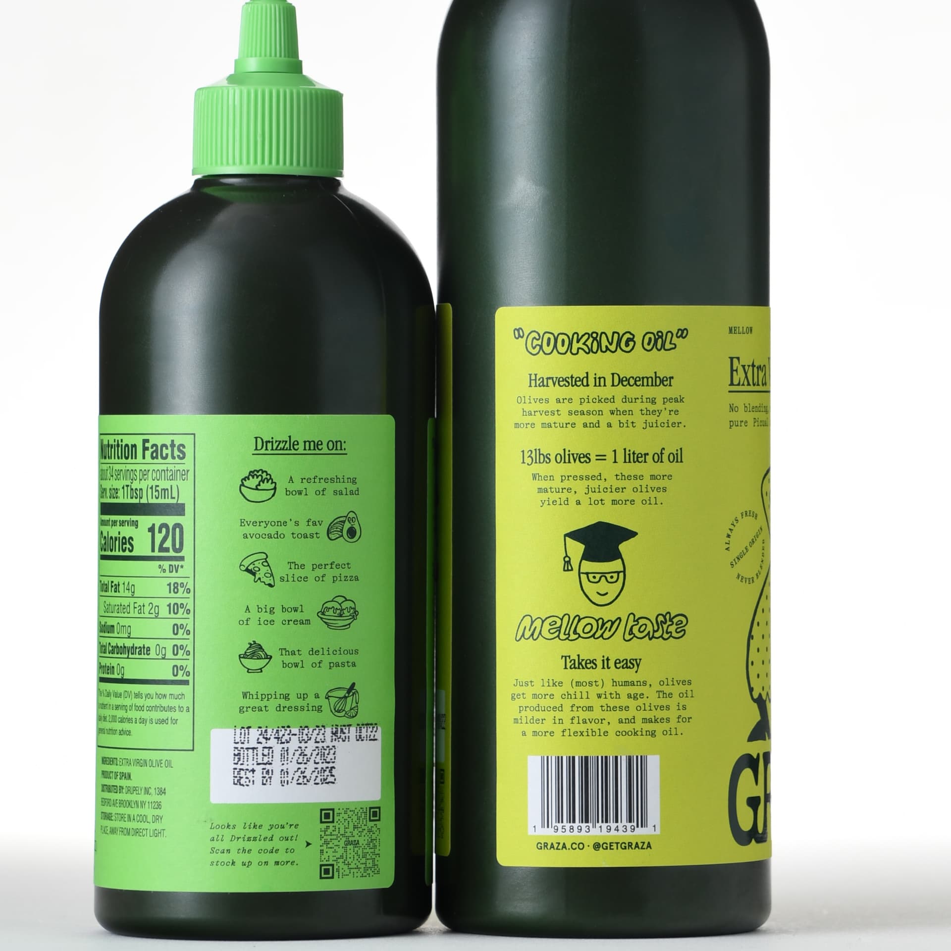 The Graza labels provide the harvest dates and cheeky yet educational serving suggestions. The “Drizzle” oil is billed as an early (December) harvest best for dressing dishes, while the “Sizzle” is from late-harvested fruit and better for cooking. The labels explain the different yields obtained at the two harvest times: “24 lbs of olives = 1 liter of oil” for the late harvest and “13 lbs of olives = 1 liter of oil” for the early harvest, thereby explaining the bottle size and pricing.