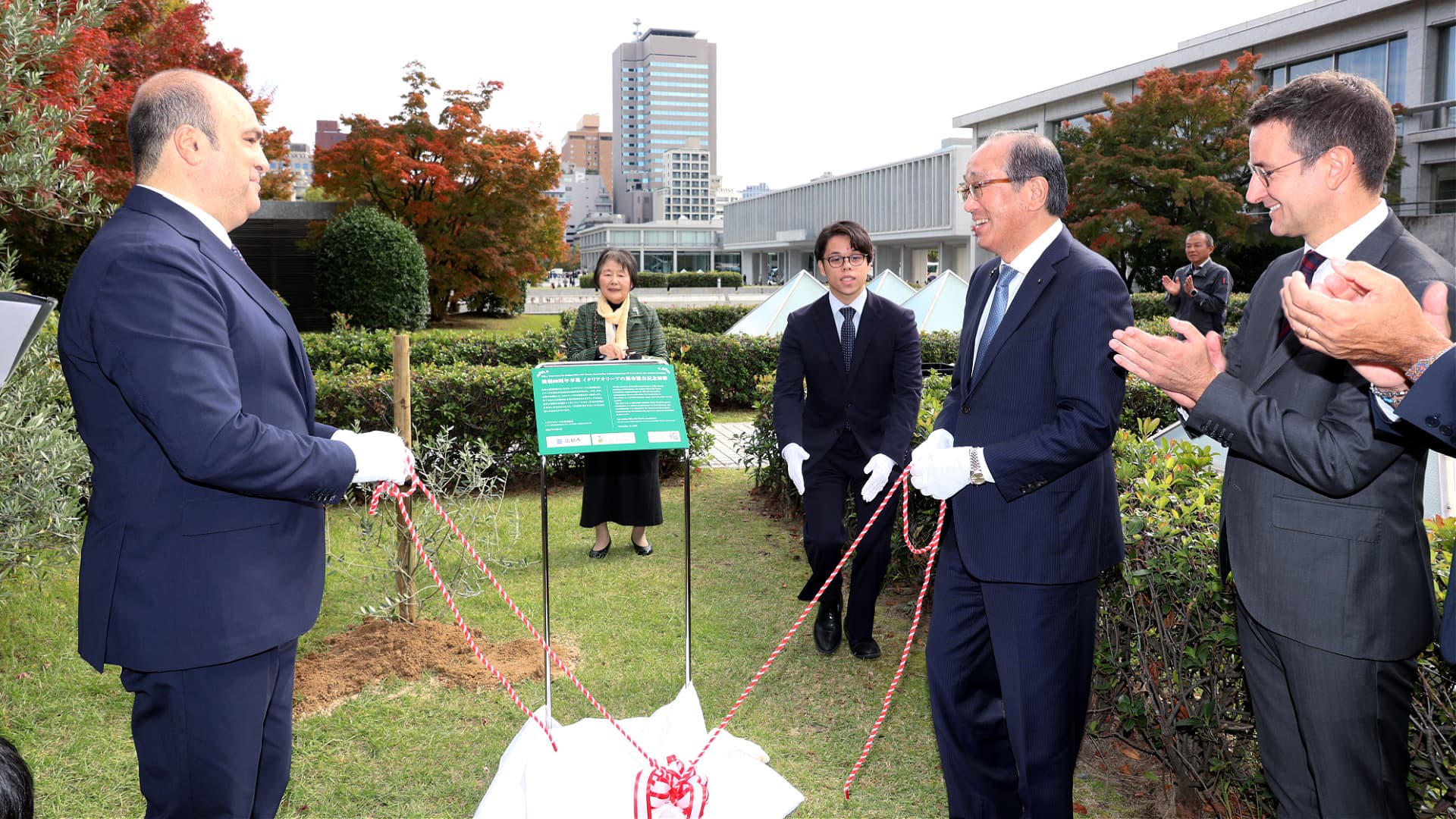 A ceremony for the planting of the ‘Olive Tree of Peace’ was held on November 11 in the presence of Hiroshima Mayor Kazumi Matsui, municipal authorities and an Italian delegation. The delegation included Città dell’Olio president Michele Sonnessa and director general Antonio Balenzano, as well as Italy’s consul general in Osaka, Filippo Manara, and representatives of the Italian Embassy in Japan.