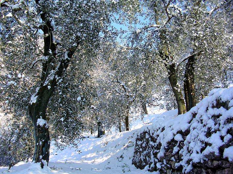 Snow on the olive trees at Agraria Riva del Garda