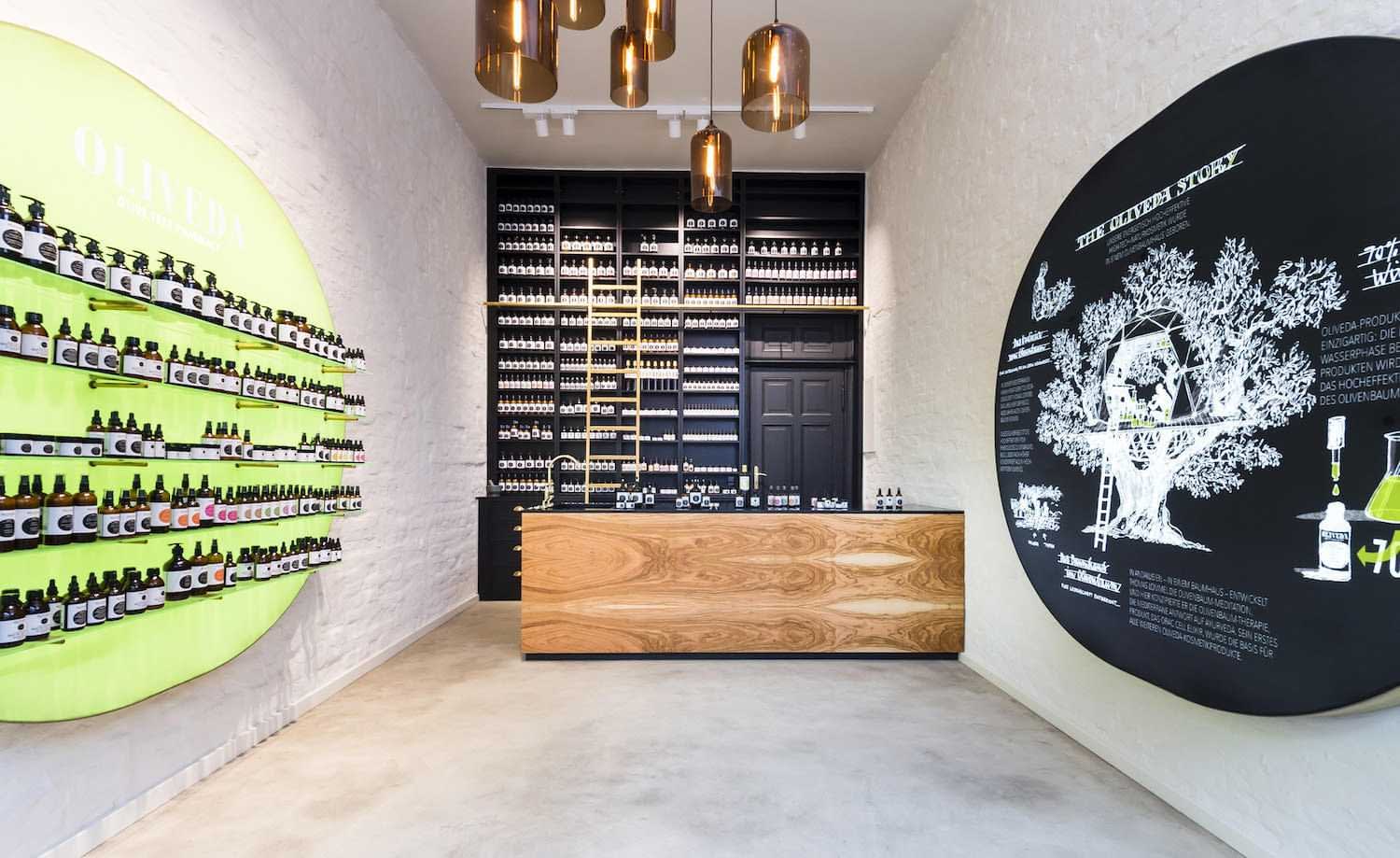 In 2015, Oliveda opened its first Olive Tree Pharmacy in Berlin. This was quickly followed by stores in Düsseldorf and Taipei. The olive-based skin care products are packaged in brown, pharmacy-style bottles and flasks.